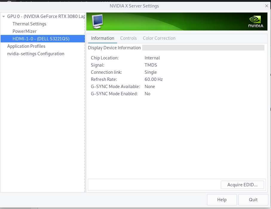 [email protected]:~$ xrandr --setprovideroutputsource NVIDIA-G0 modesetting [email protected]:~$ xrandr --auto [email protected]:~$ lshw -c video WARNING: you should run this program as super-user. *-display description: VGA compatible controller product: GA104M [GeForce RTX 3080 Mobile / Max-Q 8GB/16GB] vendor: NVIDIA Corporation physical id: 0 bus info: pci@0000:01:00.0 version: a1 width: 64 bits clock: 33MHz capabilities: vga_controller bus_master cap_list rom configuration: driver=nvidia latency=0 resources: iomemory:600-5ff iomemory:640-63f irq:195 memory:5f000000-5fffffff memory:6000000000-63ffffffff memory:6400000000-6401ffffff ioport:4000(size=128) memory:60000000-6007ffff *-display description: VGA compatible controller product: Intel Corporation vendor: Intel Corporation physical id: 2 bus info: pci@0000:00:02.0 version: 01 width: 64 bits clock: 33MHz capabilities: vga_controller bus_master cap_list rom configuration: driver=i915 latency=0 resources: iomemory:640-63f iomemory:400-3ff irq:176 memory:642c000000-642cffffff memory:4000000000-400fffffff ioport:5000(size=64) memory:c0000-dffff memory:4010000000-4016ffffff memory:4020000000-40ffffffff WARNING: output may be incomplete or inaccurate, you should run this program as super-user.